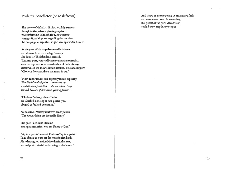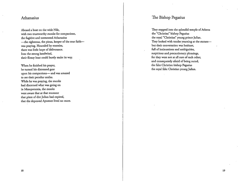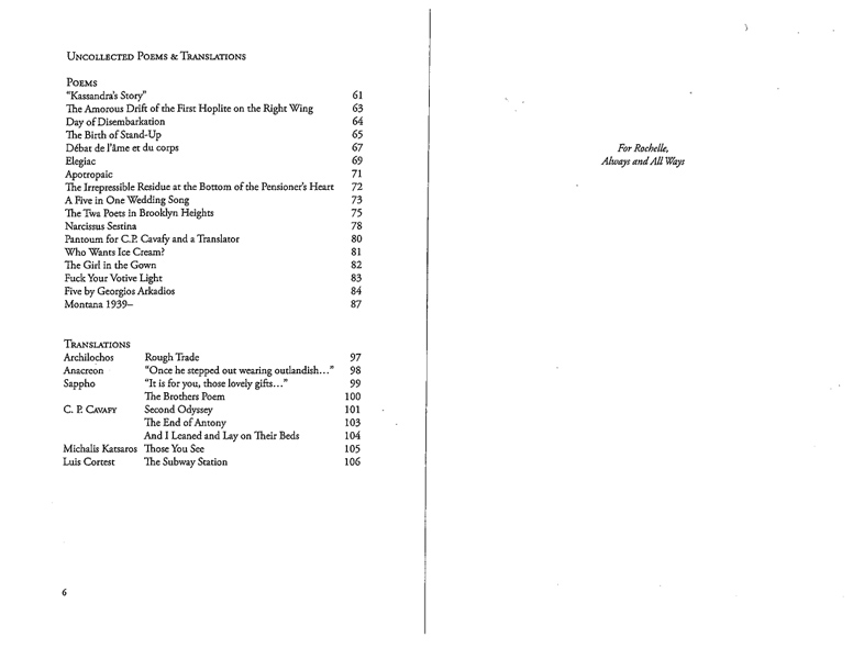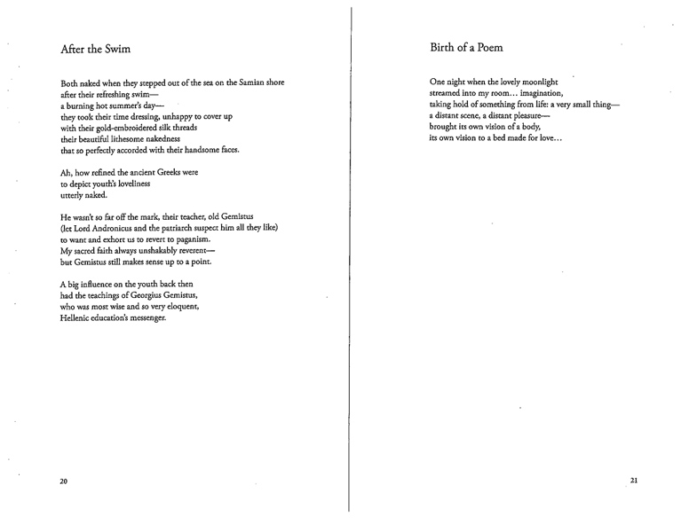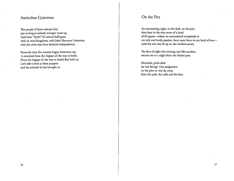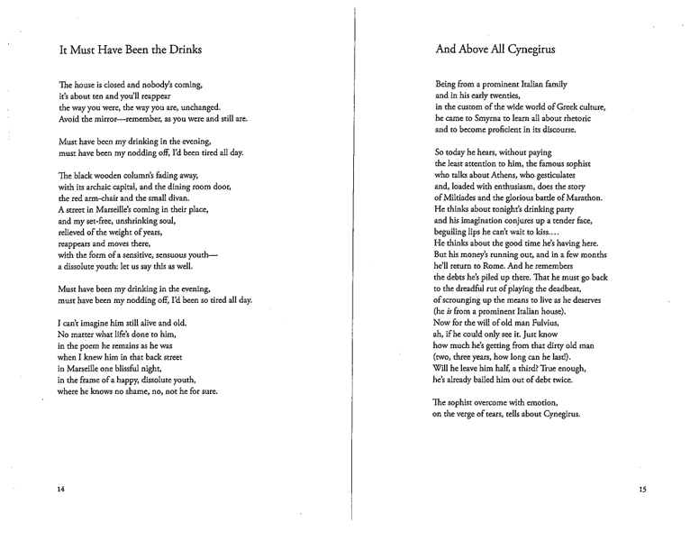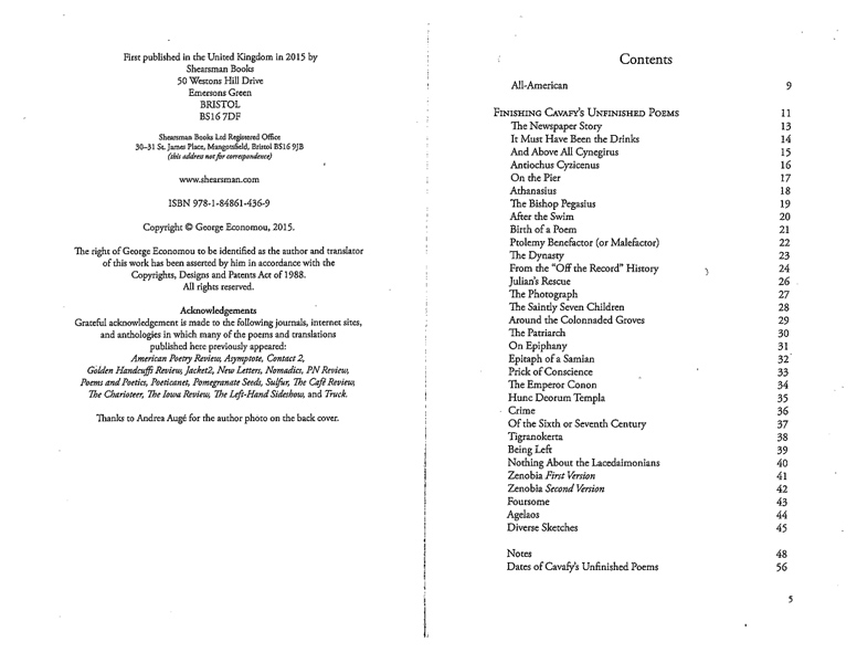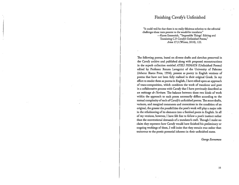 Rather than fulfilling the conventional job of a translator, George Economou uses his poetic disposition to translate and then complete the unfinished poems of the late Greek poet C. P. Cavafy. While Economou does not insist that he is the authority on how Cavafy would have finished the poems, he presents these poems as an artistic vision, written in the spirit of a classic poet.